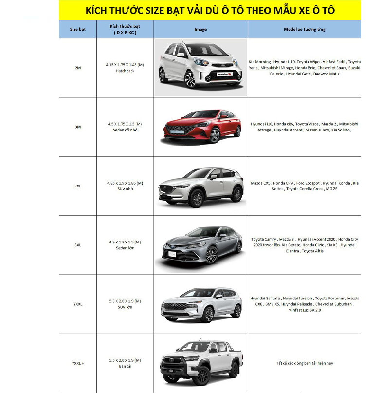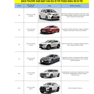 - Kích thước: Xe ô tô từ 4 đến 7 chỗ.