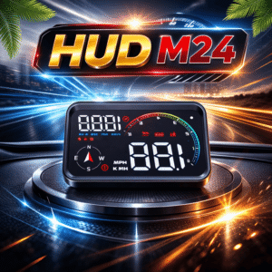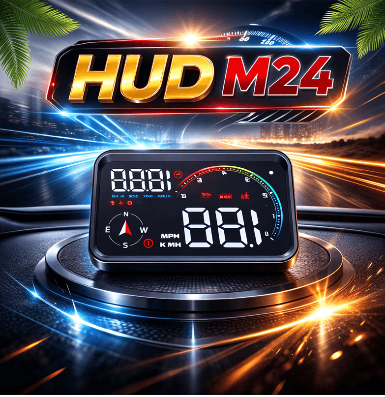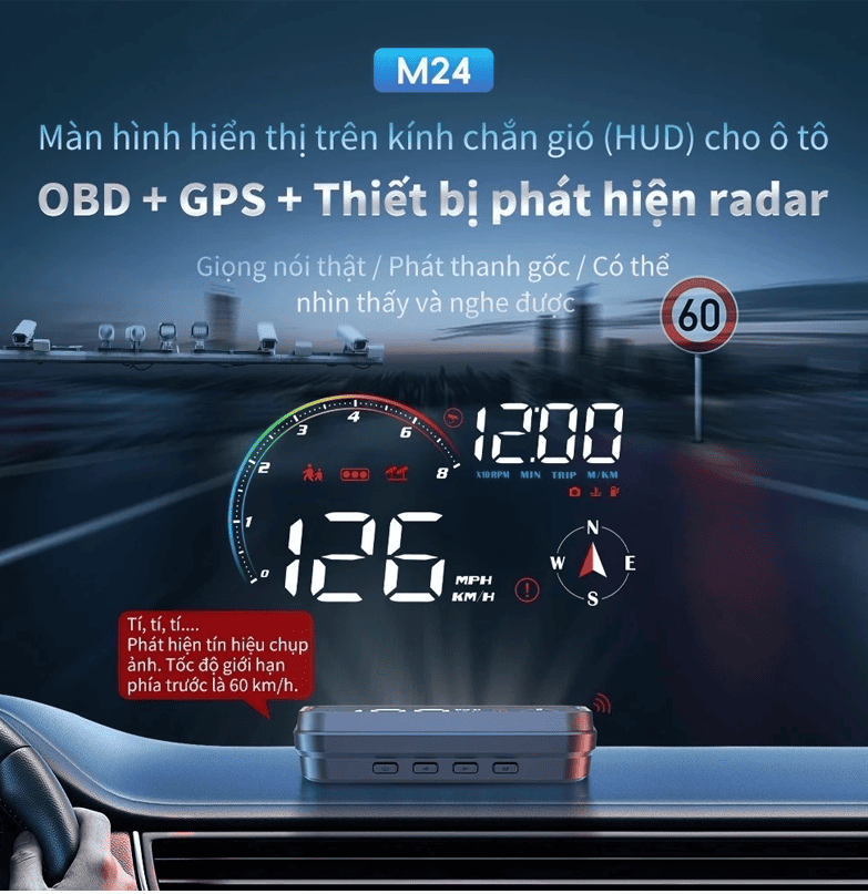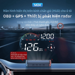 HUD M24 (Head-Up Display) là thiết bị hiển thị thông tin như tốc độ, hướng di chuyển, cảnh báo… trực tiếp lên kính lái hoặc màn hình riêng, giúp tài xế dễ dàng quan sát mà không cần cúi xuống bảng đồng hồ.