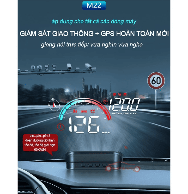 - Hiển thị tốc độ lái xe, quãng đường đã lái, thời gian đã lái, đồng hồ và nhiều chức năng hữu ích dành cho lái xe. Ngoài ra M22 tích hợp các chức năng cảnh báo tốc độ khi vượt quá tốc độ ngưỡng cài đặt.