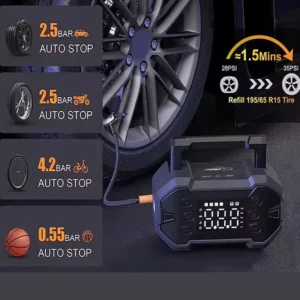 - Khắc phục lốp xuống hơi tức thì: Thời tiết thay đổi, lốp tụt áp là chuyện thường. Cài PSI trên LCD, bơm nhanh – tự ngắt khi đạt mức an toàn.