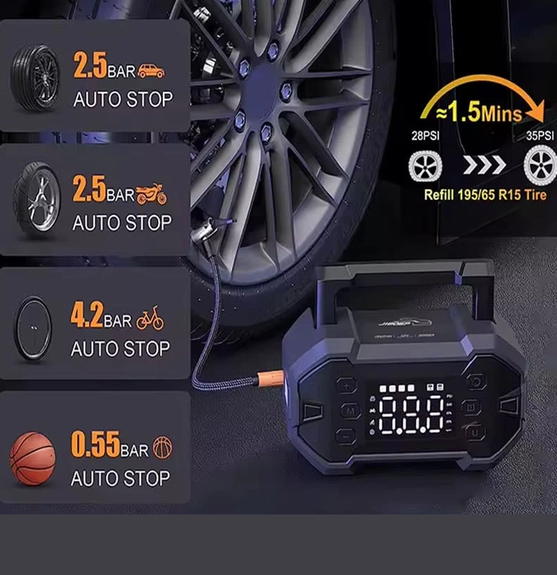 - Hai chức năng trong một: Bơm lốp và kích nổ 12V trong cùng thiết bị – xử lý gọn hai sự cố phổ biến: lốp non & bình yếu.